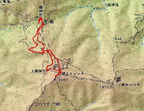 | 自宅am6:30-R193-脇町-貞光-R438-見の越しam9:00-出発am9:10 祖谷谷源流の谷am9:30-西島駅am10:00-大剣神社am10:25 山頂(昼食)am10:50-出発am11:35-刀掛けの松am11:50 西島駅pm12:00-見の越しpm12:30-名頃-東祖谷-西祖谷-大歩危 R32-池田-猪鼻峠-琴平-自宅 ■歩行時間約3時間(休憩含む) |