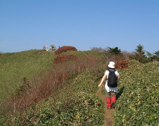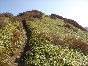 鎖場を登りきると笹原...青空の下、足取りも軽く進む♪