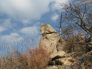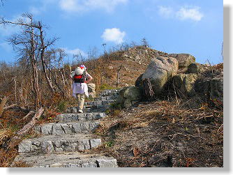▲2005年の山火事!二年経った今でも〜 ▲ゴロゴロの岩の間を歩きます ▲目の前の二本電波塔が立っている山が鷲ガ頭山!