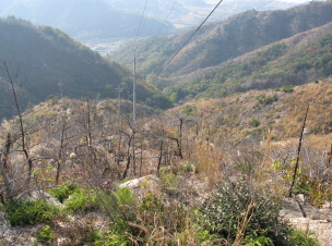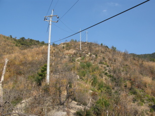 ▲こんな道?を下りるの?イバラ攻撃に参りました^^; ▲鉄柱に沿って下ります ▲歩いた稜線が上に見えます ▲ジャングル(笑)に突入〜っ!