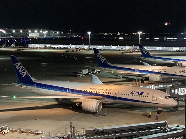 夜の羽田空港・・・・ANAの飛行機を写してますが私達が乗るのはエミレーツ航空