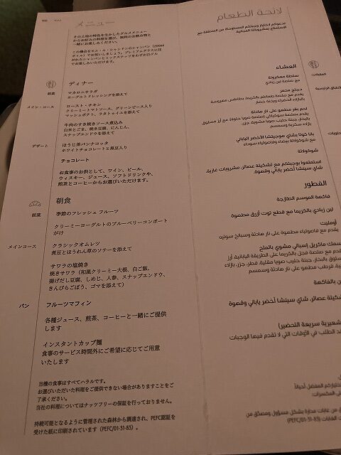 機内食のメニュー・・・日本語で書かれていたので、よくわかりました
